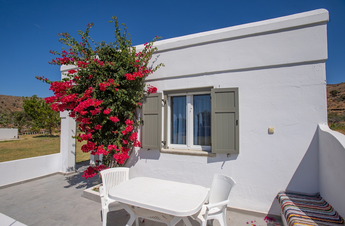 monolocale 25 mq con magnifica vista mare, si trova a 5m. dalla spiaggia di Kalo Livadi, in grado di ospitare fino a 3 persone. Camera a pianta aperta con 1 letto matrimoniale e 1 letto singolo, bagno con doccia, angolo cottura completamente attrezzato. Davanti al monolocale c'è un cortile pianeggiante a 500m. con piante e alberi che offre momenti di tranquillità e relax.