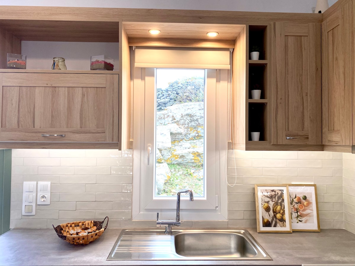 This brand new unique stone building was completed in 2022, with exterior walls built with the rocks excavated from its foundations, graciously blending the property with its natural environment in an eco-friendly manner, offering panoramic views of the sea in-front, Kamares beach, and the whole of Kamares Bay. And if you think that the view is breathtaking during day time, wait until sunset... Located in Agia Marina, a neighborhood of Kamares town, seated at the base of Agios Symeon mountain.
