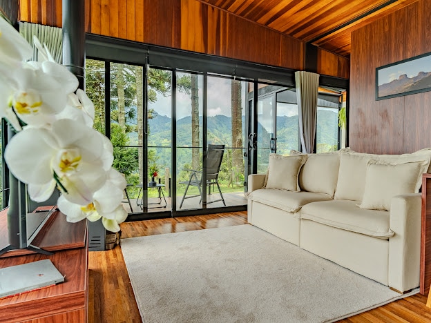 Scopri "Mirante da Coruja", un rifugio tranquillo tra le cime degli alberi, costruito con legno di pino di Riga rigenerato. Questo chalet con pareti in vetro offre privacy, comfort e viste mozzafiato. Dotato di caminetto, terrazza privata e ampia terrazza, è il luogo ideale per festeggiamenti speciali e momenti di relax, unendo l'autenticità dell'arte locale alla magnifica natura circostante.