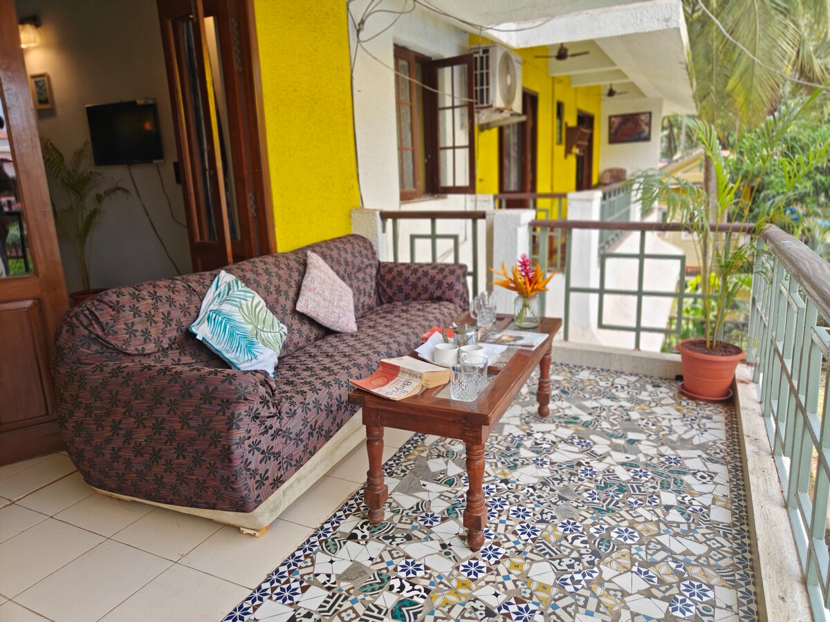 Immagina di entrare in un appartamento moderno e progettato con cura, con lussureggianti giardini commestibili sul balcone, che condividi con uccelli e scoiattoli. Situato a Siolim Marna, questo alloggio con 1 camera da letto è progettato per coppie, viaggiatori solitari e famiglie non convenzionali in vacanza breve, in un soggiorno di lavoro più lungo o in un rifugio tranquillo. Amiamo tutto ciò che riguarda il design e il fai da te. Ogni mobile è stato riciclato e abbiamo cercato di pensare a tutto ciò di cui potresti aver bisogno: wifi di riserva, bar, cucina attrezzata, altalena, libri e materiale artistico!