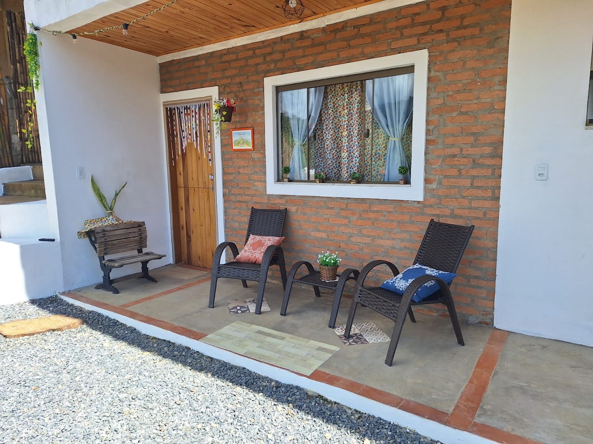 Suíte espaçosa no campo, com cozinha e vaga de garagem. Lugar único, com vista privilegiada das montanhas que cercam a cidade de Passa Quatro. A apenas 500 metros de um dos principais pontos turísticos da cidade, a cachoeira do quilombo, e a 4 km do centro turístico da cidade. Hospede-se em meio a natureza, em um lugar tranquilo e familiar!