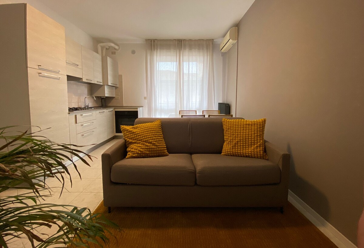 Appartamento di 43 mq con spazio esterno, lavatrice e climatizzatore. Ideale per coppie sia per soggiorni brevi che di lunga durata. Grande alimentari con ortufrutta nelle immediate vicinanze e supermercato aperto tutti i giorni a 10 minuti a piedi. Fermata dei mezzi pubblici a pochi minuti. Colline del prosecco, castello e centro di Susegana raggiungibili a piedi. Abitiamo nelle vicinanze e per gli ospiti stranieri ci facciamo aiutare dai nostri figli.