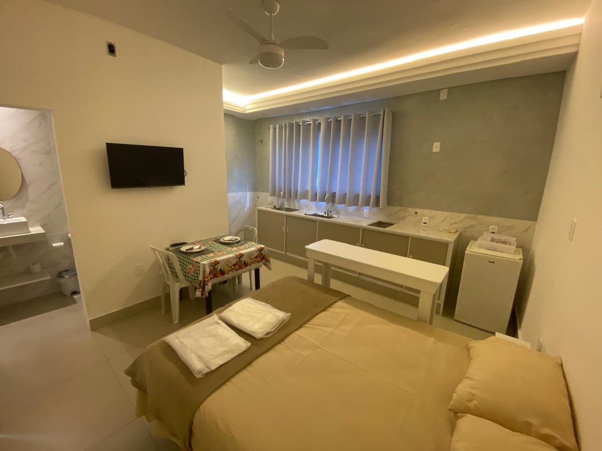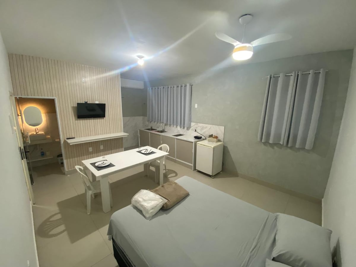 Stúdio accogliente, nuovo, spazioso, che ti aspetta. - Suite - Aria Condizionata - TV - Cucina con microonde, minibar, caffetteria con capsule, sandwich maker, piatti, posate, tazze e bicchieri. - Biancheria da letto e da bagno, sapone liquido, shampoo e balsamo - 01 posto auto - Vicino a due ipermercati, UEMG, farmacie, forum, stazione degli autobus, stazioni di servizio, ristoranti, bar, vicino al centro. Ottima posizione. cancelli - Il cancello elettronico fornirà più sicurezza e servizi.
