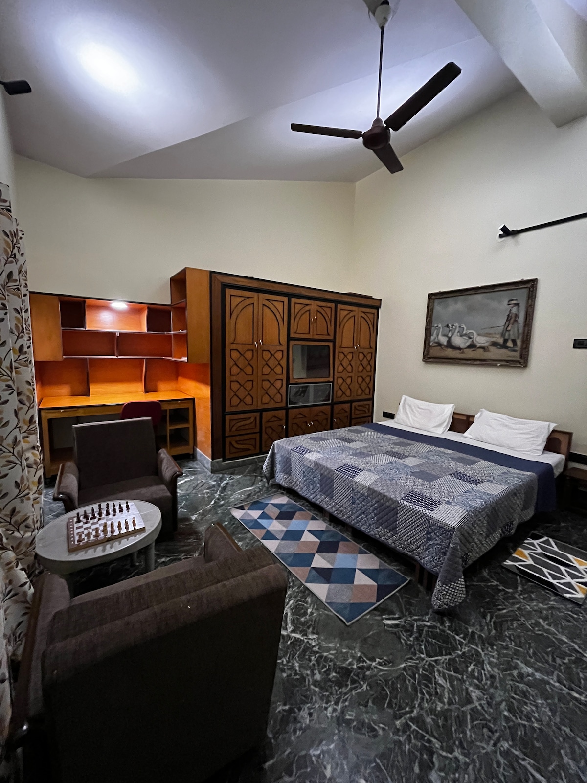A perfect "stay" where you and your family can experience a peace with a homely environment. It's an air-conditioned single bedroom, with double bed, a study table and a chair, a wardrobe with mirror attached and a locker too, to keep your valuable items safely. Room is attached with a private kitchen, induction cooktop and basic utensils for your usage. A dinning space attached also have a 4-seater dining table, and a refrigerator too.