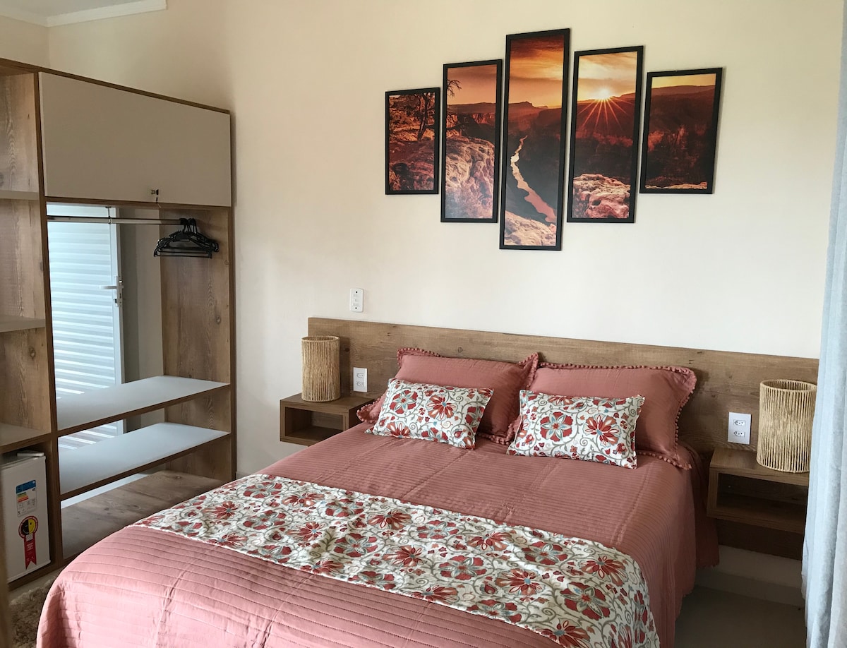 Chalet in muratura di 40 m²; 1 camera da letto di 9 m²; letto matrimoniale; TV 21''(LED); fire stick, DVD; Ventilatore a soffitto; Soggiorno; Mini cucina attrezzata (piatti, bicchieri e utensili); Microonde; Minibar; Macchina per il caffè; piastre per panini; fornello elettrico a 2 fuochi; camino; Balcone di 10 m²; Può ospitare 2 persone. Nella proprietà, sala giochi, soggiorno, piscina, sentieri, massaggi, lago per la pesca sportiva, cucina in comune, zona relax, natura ai piedi della Serra da Mantiqueira.