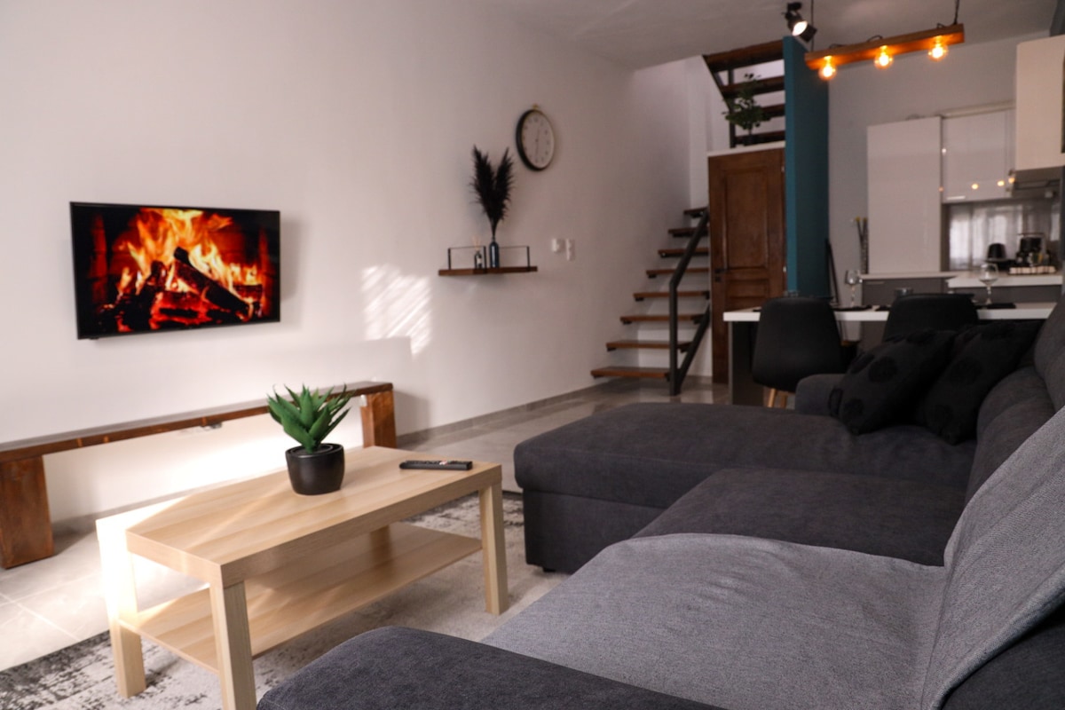 Μοντέρνο loft στο κέντρο των Τρικάλων, ιδανικό για έως 4 άτομα. Διαθέτει πλήρως εξοπλισμένη κουζίνα (Nespresso, βραστήρα, τοστιέρα, φούρνο μικροκυμάτων), Wi-Fi, δύο smart TV με Netflix, καθαρά σεντόνια, πετσέτες, παντόφλες, πιστολάκι, σίδερο, σιδερώστρα, χρηματοκιβώτιο και μπαλκόνι. Σε κοντινή απόσταση από Ασκληπιού, Μουσείο Τσιτσάνη, Μανάβικα και Μύλο των Ξωτικών.