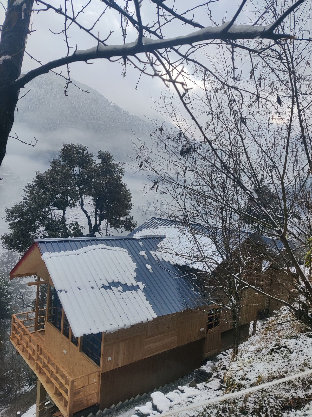 “Into the Woods Eco lodge in the middle of Apple orchards and forest with stunning views.” ★ Rustic Pinewood Architecture ★ Panoramic Views of Forests & Mountains ★ Eco-friendly Stay . ★ Wi-Fi ★ Power Backup ★ Fresh, Home-style organic Food ★ Bonfire Area ★ Indoor Fireplace & Dining Area ★ Organic Garden Surroundings Please note:- There is 500 meters trek down from parking spot to reach at property, Your luggage will be carried by us.
