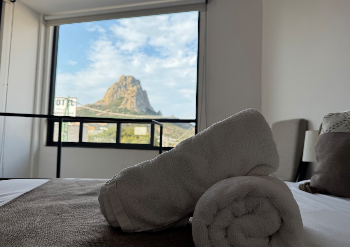 El mejor lugar para quedarte en el pueblo mágico de Bernal es nuestro hermoso departamento de dos recámaras. Cuenta con un diseño minimalista que mezcla los materiales y la flora caracteristicos de la región para lograr un ambiente agradable que siempre estará enmarcado por la Peña de Bernal, ya que fue orientado para tener las mejores vistas del monolito. Nos encontramos en el centro de la ciudad, es perfecto para moverse caminando. Contamos con vigilancia a todo momento y la mejor terraza.