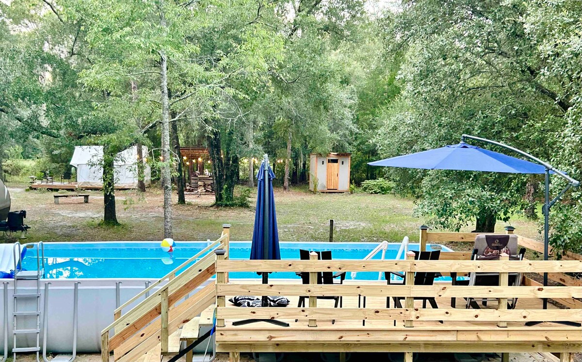 - Vivi la natura con tutti i comfort di casa - L'aria condizionata ti mantiene fresco! La stufa ti tiene al caldo! - Letto king size Casper, terrazza, braciere, macchina per il caffè, - Bagno privato - Situato a Black Creek - Grande piscina fuori terra con ponte - Barbecue - A meno di 15 minuti da negozi di alimentari/ristoranti locali - 40 minuti dal centro di Jacksonville - 50 minuti da St. Augustine Se hai difficoltà a prenotare la tua data preferita o hai un gruppo, inviaci un messaggio per maggiori informazioni su 1 tenda e cabina aggiuntive nella proprietà.