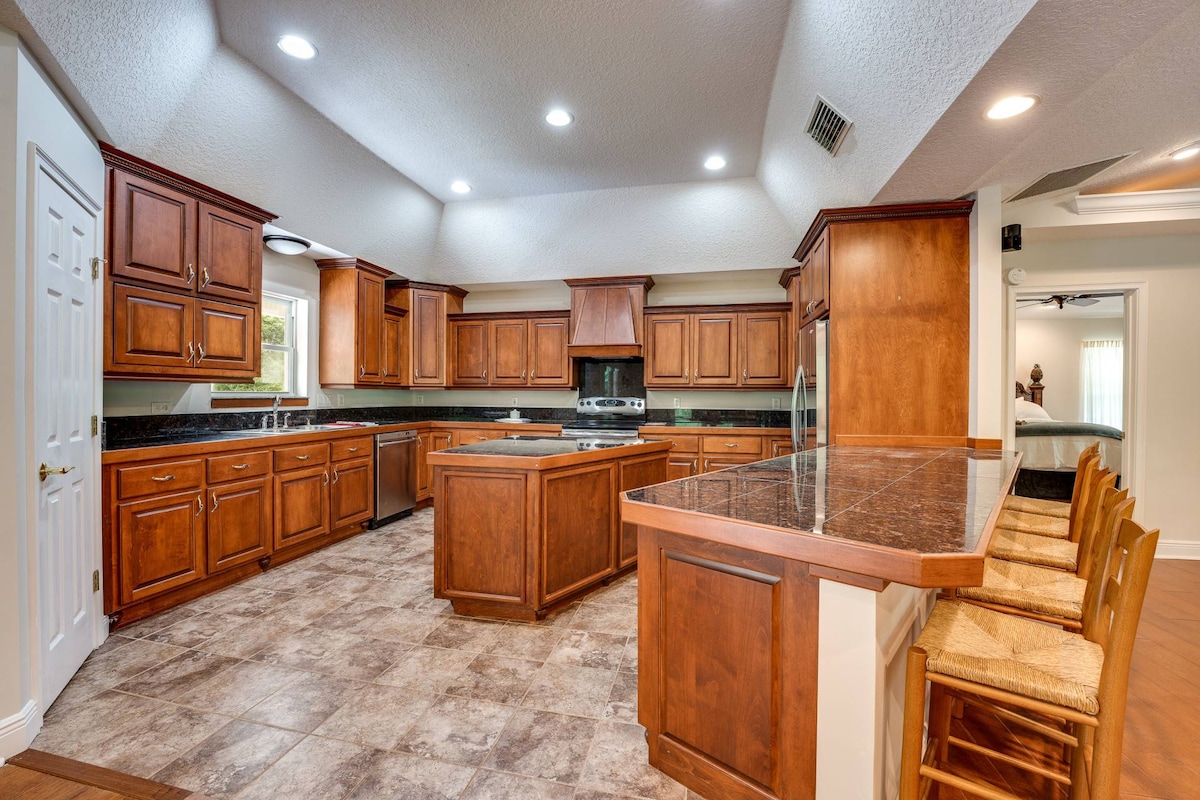 Incantevole casa a un piano nella tranquilla Green Cove Springs (30 min a sud di Jax). Piscina privata nel cortile + patio coperto con ventilatori a soffitto, TV all'aperto, sedie a dondolo e barbecue a gas. Palestra garage: cardio, pesi, power rack. Camera da letto principale: letto king size, spazio di lavoro dedicato con smart TV, bagno privato. Altri letti: matrimoniale + castello. Cucina attrezzata, soggiorno open space con camino e grande smart TV. Parcheggio per camper (50 ampere + acqua/fognatura) + pesce dal lago del cortile! Rifugio sereno per famiglie/gruppi.