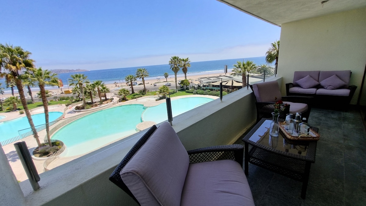 Bellissimo appartamento familiare, con vista sul mare in un settore esclusivo di La Serena con diverse piscine per età diverse, dispone anche di una piscina con onde artificiali e una piscina riscaldata, gazebo, sauna e vasca idromassaggio e la bellissima spiaggia di La Serena di fronte al condominio, oltre a ristoranti, pub e fiere artigianali.