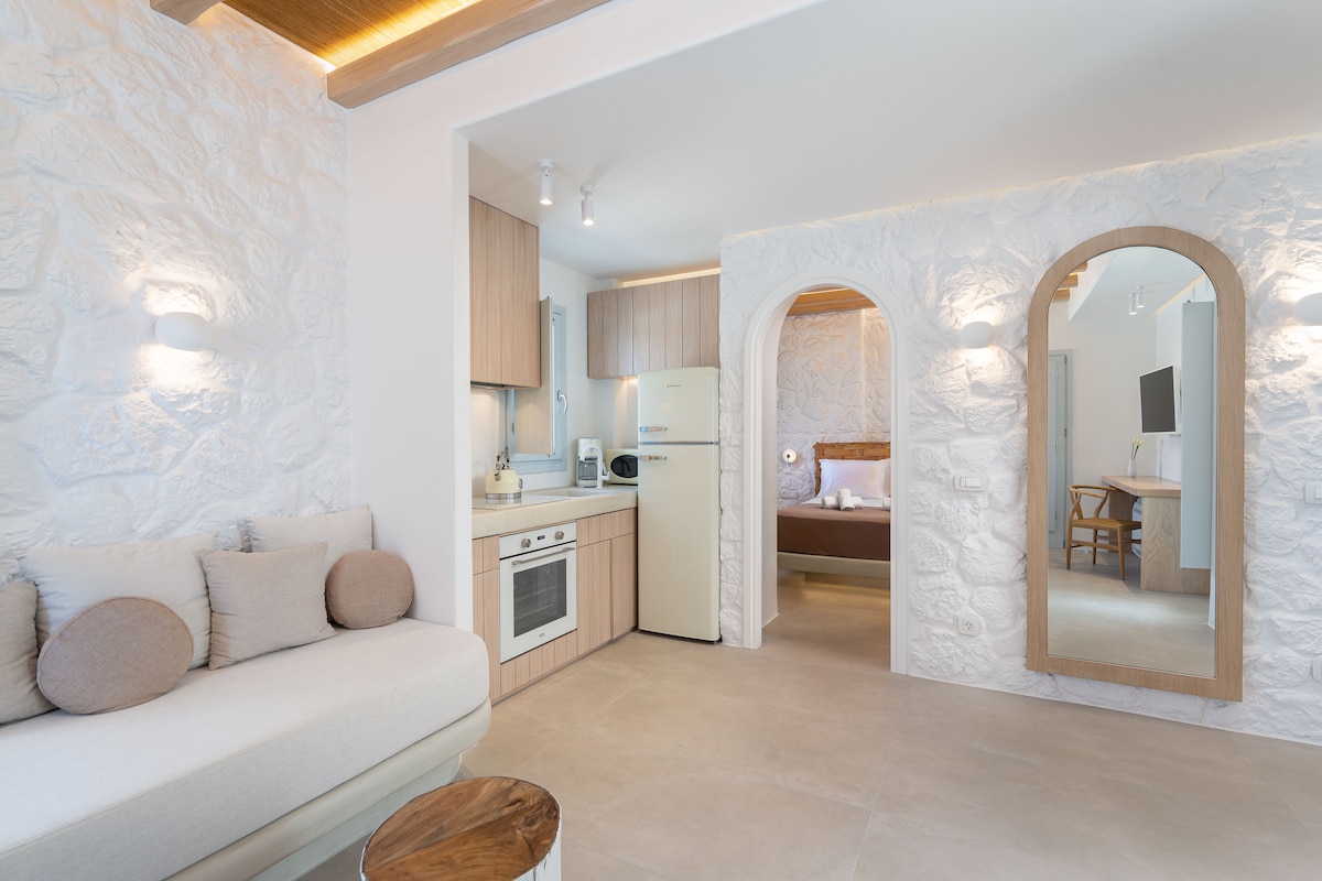 Questa elegante suite è arroccata sulle scogliere della caldera di Oia. Combina l'architettura tradizionale delle Cicladi con uno stile decorativo minimal, rendendolo la scelta perfetta per chi desidera rilassarsi. La suite è di circa 37 m², dispone di una vasca idromassaggio privata all'aperto, che offre privacy e una vista mozzafiato sulla caldera e sul vulcano. La colazione è compresa nel prezzo. La camera è dotata di aria condizionata, Wi-Fi gratuito, set per la preparazione di tè e caffè, prodotti da bagno e smart TV.