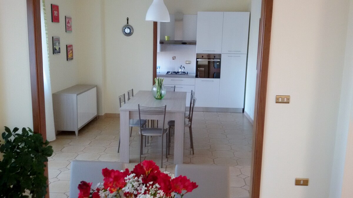 Grazioso bilocale ideale per una coppia in viaggio, o per chi lavora, al secondo piano servito da ascensore, composto da cucina attrezzata di tutto e con lavatrice; camera-soggiorno con letto matrimoniale, divano 3 posti, tv, scrivania, ventilatore a soffitto. 100 m da spiaggia libera con chiosco bevande e doccia; 700 m da stazione ferroviaria, terminal bus; 300 m da zona locali; zona centrale e di passeggio (parco lineare "strada parco"), ampiamente servita da mezzi di trasporto pubblico