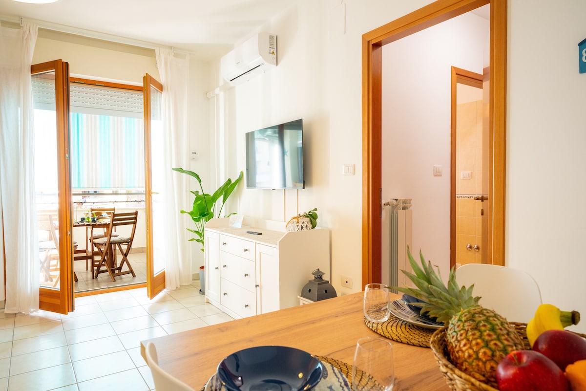 Ambientalmente sostenibile, a 4 minuti a piedi dalla spiaggia, in centro ma in zona verde e tranquilla. Ha cucina luminosa con piano snack, soggiorno con ampio divano e balcone, 2 camere da letto con balcone, 2 bagni con doccia e bidet. Aria condizionata in ogni stanza, lavatrice Samsung, lavastoviglie, forno (anche a vapore), Smart Tv, Wifi, Speaker,serrande e tende da sole automatizzate, infissi Schuco, parcheggi in strada gratuiti. Ombrellone x spiaggia offerto. Supermercati a 2 min a piedi