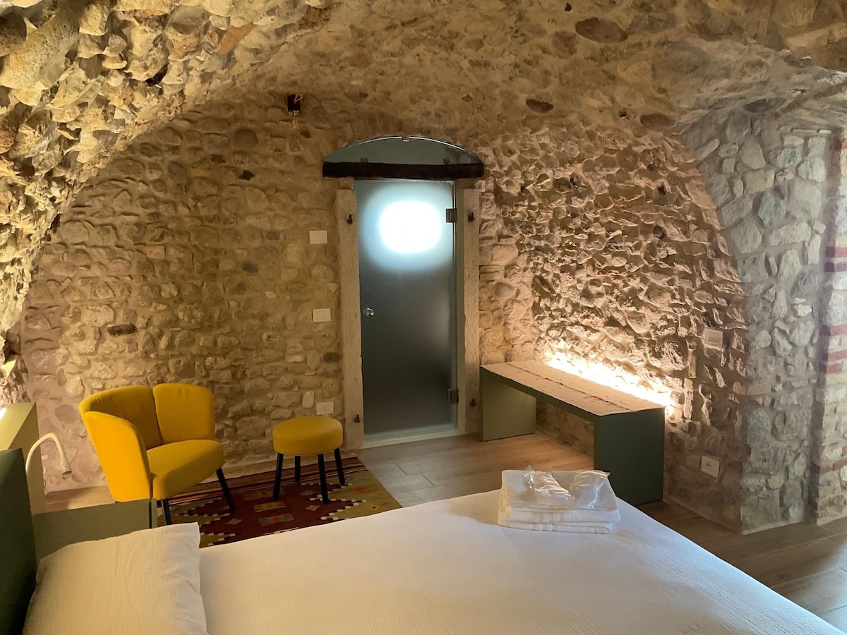 Appartamento piacevole e finemente ristrutturato, curato nei minimi particolari, pur conservando integro l'aspetto storico del locale. La stanza da letto è interamente in sasso, come era originariamente e risulta fresca in modo naturale d'estate e calda, grazie al riscaldamento a pavimento, durante l'inverno . La cucina è attrezzata di tutto quanto necessita per un pranzo o per una piacevole colazione. All'esterno vi è un giardino con angolo relax.