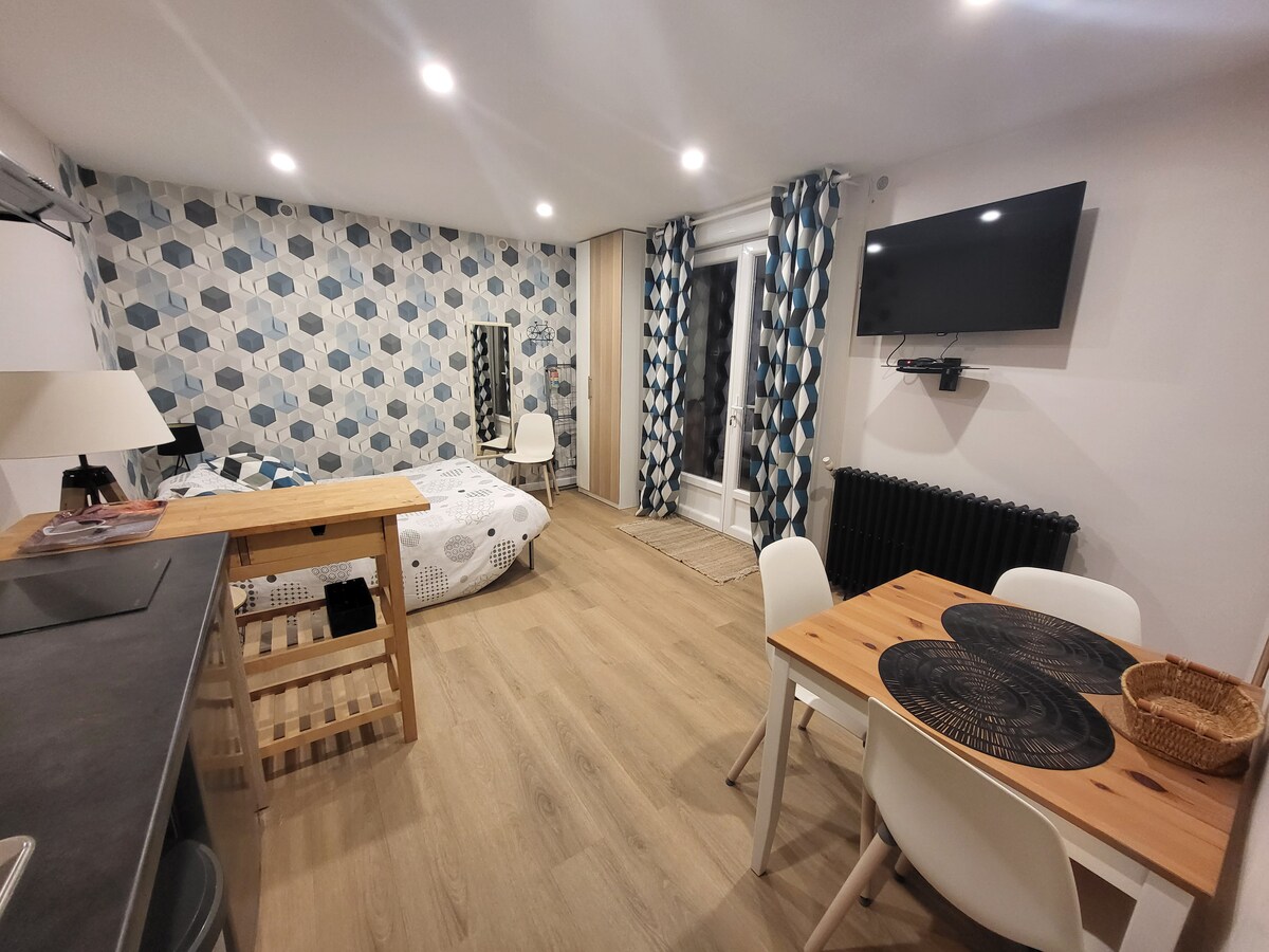 Alloggio di 20 m2 ristrutturato, climatizzato e completamente attrezzato. È confortevole, silenzioso e luminoso. Nelle belle giornate, potrete godere della vostra terrazza privata e senza dirimpettai. È adatto per una persona o una coppia con un bambino. Potete parcheggiare gratuitamente in strada. Cancellazione gratuita fino a 5 giorni prima del vostro arrivo. La settimana gli arrivi sono a partire dalle 17:00 e le partenze alle 11:00. E il fine settimana a partire dalle 14:00 e partenze alle 11:00.