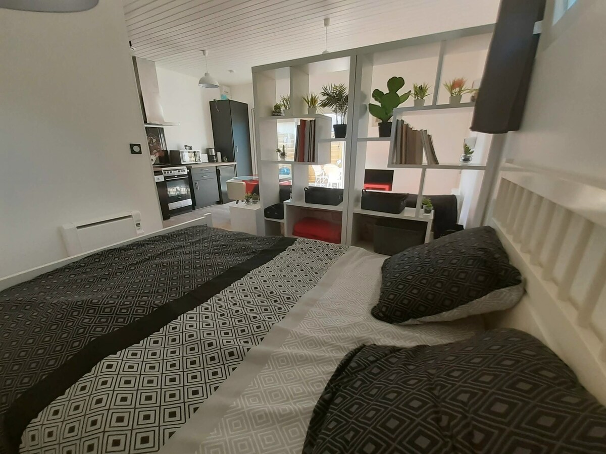 Facile da raggiungere, monolocale completamente ristrutturato al piano terra della nostra casa, benvenuto in un piccolo posto dove è bello rilassarsi, lavorare, visitare e ritrovarsi soli o in coppia. Il monolocale è composto da un letto con materasso nuovo per 2 persone (biancheria da letto e da bagno fornita) Una cucina completamente attrezzata Un bagno (asciuga capelli e piastra per capelli forniti) Un piccolo giardino Arrivo in autonomia (cassetta delle chiavi) a partire dalle 15:00. Piacere di conoscervi