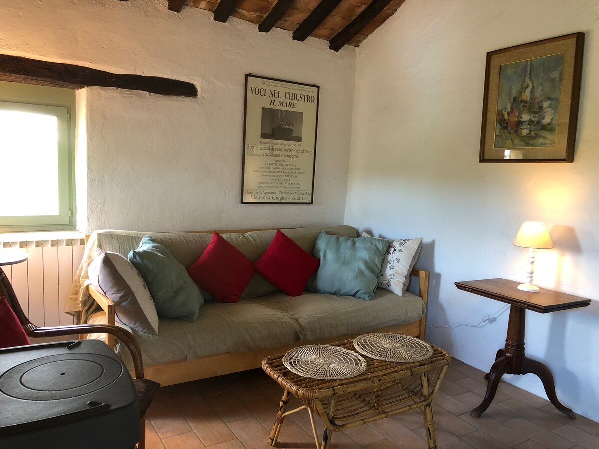 A cosy renovated traditional stone cottage surround by countryside with breathtaking views & wood~fired hot tub. It is secluded and peaceful yet only a 5 min drive to the local village and amenities. In 35 minutes by car you can find yourself in the Sibillini national park or in the other direction the Adriatic coast. Numerous local restaurants within 20 mins drive serving fantastic food. If you enjoy walking or hiking, cycling, shopping or just relaxing this is a great place.