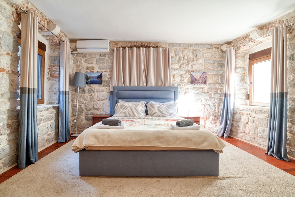 Questa vecchia casa in pietra sul lungomare è stata costruita originariamente nel XIX secolo e completamente ristrutturata nel 2018. Gli interni rappresentano un mix di stile tradizionale mediterraneo combinato con un design moderno. Situata in un tranquillo vecchio villaggio di pescatori chiamato Muo, la nostra casa è la base perfetta per esplorare la baia. Il centro storico di Kotor dista meno di 10 minuti in auto, mentre l'aeroporto di Tivat dista meno di 20 minuti. La casa ha tre livelli e ogni livello offre una vista indisturbata sul mare.
