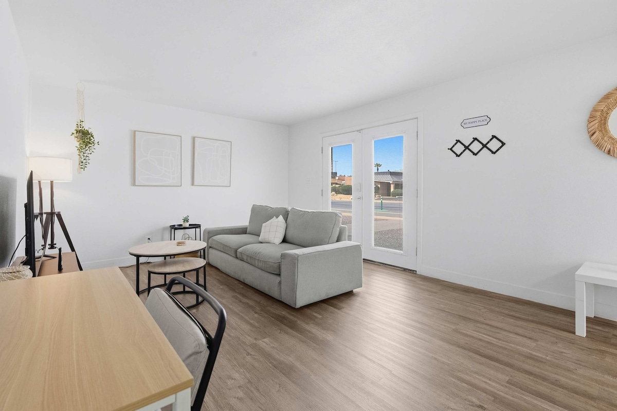 Benvenuto in questa nuovissima unità dal design unico! Ispirato alla stravaganza di un parco camper degli anni '50 e al fascino di un cottage in cortile. I nostri design privati, luminosi e luminosi sono completamente attrezzati con tutti gli elementi essenziali per far sentire il tuo soggiorno come una seconda casa. Alberi ombreggiati e lussureggianti paesaggi desertici circondano due cortili condivisi con barbecue, bracieri e mobili da esterno in modo che i residenti possano godersi l'invidiabile stile di vita all'interno e all'esterno dell'Arizona.