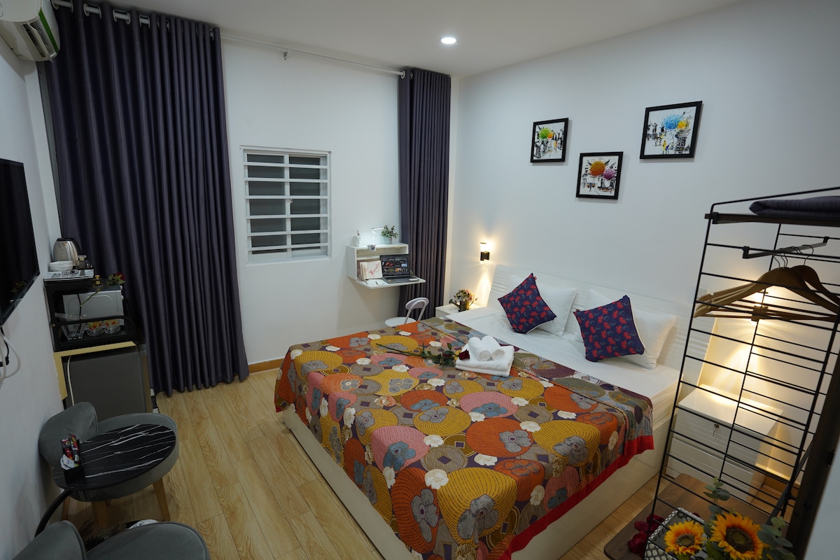 Il mio spazio unico ha uno stile tutto suo. Si trova in via Phan Dinh Phung, nel distretto di Phu Nhuan, e dista 5 minuti dal Distretto 3 e 10 minuti dall'aeroporto. - Un monolocale ha un balcone - 1 letto comodo - Bagno: asciugamano, acqua calda, shampoo, bagnoschiuma, carta igienica - Cucina: frigorifero, utensili da cucina di base - Ascensore, lavatrice, smart TV, aria condizionata, divano, guardaroba, asciugacapelli, wifi veloce - Facile self check-in/out Forniamo il servizio di pulizia 2 volte a settimana e il parcheggio per moto GRATUITAMENTE.