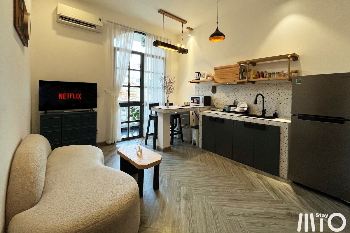 Newly built, launched in Dec 2023! Located in a quiet alley in downtown Saigon, our cozy studio combines a unique design with whimsical charm. Amenities include fully equipped kitchen, bathroom with rain shower, Netflix & ultrafast 250+ Mbps wifi . At ground, you can enjoy a snack or coffee at the Hai Cai Tay Cafe. We also have a washer/dryer for our in-house guests. We are right next to the Wink Hotel & in walking distance to many restaurants, cafes, and bars.