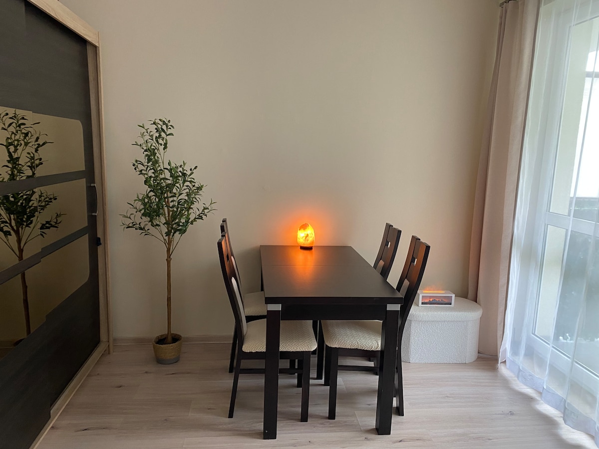 Appartamento moderno nel cuore di nuovi edifici. La cucina è completamente attrezzata con frigorifero, lavastoviglie, bollitore, forno a microonde, posate, pentole, utensili e altri articoli da cucina. La macchina del caffè ti aiuta a gustare il caffè! L'appartamento dispone di una grande scrivania con monitor, tastiera, una grande smart TV e un armadio molto spazioso! Nella camera da letto, un grande letto comodo e un grande divano letto possono ospitare 4 adulti. Altri servizi a disposizione degli ospiti sono una lavatrice, un ferro e un'asse da stiro e uno stendibiancheria.