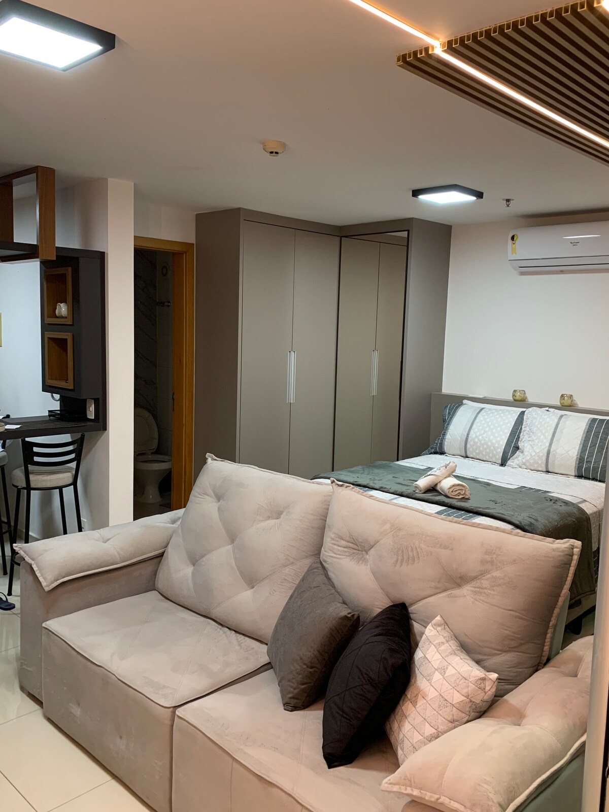 Abbracciate lo stile in questo luogo tranquillo e ben posizionato. L'unità "Praiana" è il tuo posto con stile, tranquillità e posizione perfetta a Brasilia. Si trova nel Plano Piloto ed è a pochi passi da supermercati, ristoranti, farmacia 24 ore su 24, panetterie, salone, caffetterie. Forniamo lavatrice e asciugatrice nell'unità. È un PICCOLO spazio (18 m²) che ha tutto il necessario. Cucina attrezzata, asciugacapelli, ferro da stiro e un arredamento unico. Decorata con design!