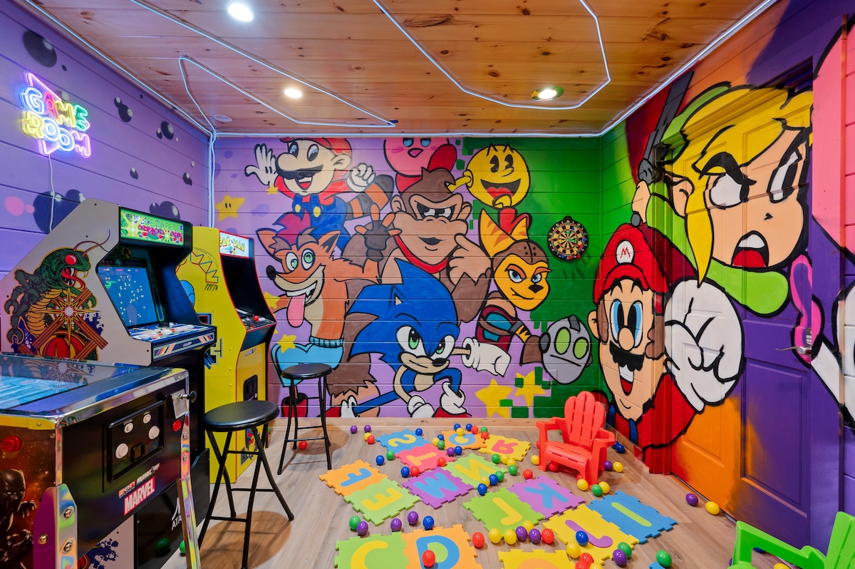 Svegliati con vista sulle montagne 🌄 e caffè fresco dall'accogliente bar della baita☕. Trascorri la giornata esplorando Dollywood 🎢 o facendo escursioni sulle Smoky Mountains🌲, poi torna a casa per immergerti nella vasca idromassaggio🛁, ridere intorno al focolare 🔥o goderti la serata cinema nel tuo teatro privato🎬. Sfida i tuoi amici a una partita a biliardo o a Pac-Man nella sala giochi🎮, poi ritirati in una delle 6 comode camere da letto. All'Alpine Lodge, ogni momento sembra un ricordo in divenire: la tua storia perfetta sulle Smoky Mountains inizia qui. 🏔️