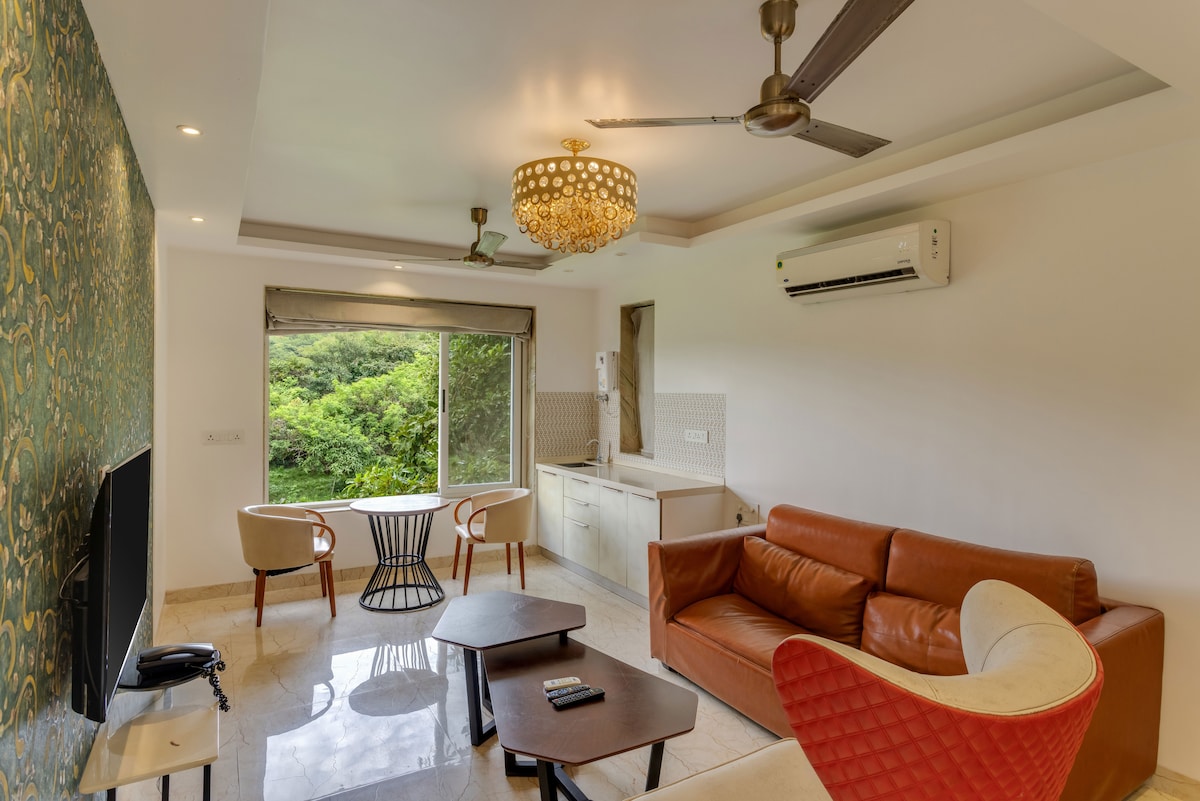 A ◆soli 4,4 km dalla spiaggia di Candolim. ◆Piscina sul tetto, gazebo accogliente e vista mozzafiato: perfetto per serate rilassanti. ◆Camera da letto con interni eleganti e bagno privato con vasca idromassaggio. Appartamento con◆ 1 camera da letto e balcone, perfetto per una vacanza indimenticabile a Goa. ◆Soggiorno con comodi divani, TV, balcone privato e zona pranzo. ◆Goditi un servizio di alto livello da un team di ospitalità a 5 stelle con lo spirito di "Atithi Devo Bhava"