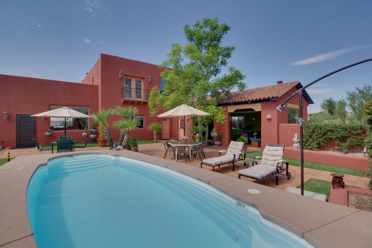 Welcome to the Owl House, a resort-like desert retreat built in classic hacienda style with modern touches and comforts and a splash of southwest. With wood beams throughout, twenty-five foot wood paneled ceilings in the entry zaguan, an iron chandelier, classic saltillo floors and Spanish talavera tiles, it will feel as if you are stepping back in time, but yet you'll be surrounded by modern luxurious amenities like a knife edge pool and hot tub, fire pit, and 48-inch stove.