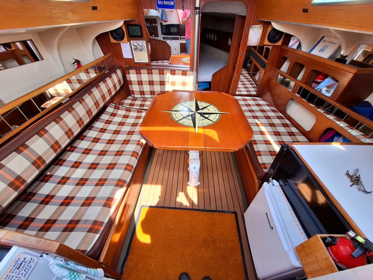 Barca a vela di 8m30 con cabina doppia anteriore Salone con 1 divano letto matrimoniale e una cuccetta per bambini, tavolo con 2 ribalte, cucina con fornello a 2 fuochi, forno a microonde, frigorifero e freezer, stoviglie complete per 4 persone Macchina per il caffè elettrica a cialde Piccolo bagno La barca è riscaldata, quindi molto piacevole in inverno Parcheggiato idealmente il retro completamente a sud Tavolo da esterno rimovibile con ombrellone