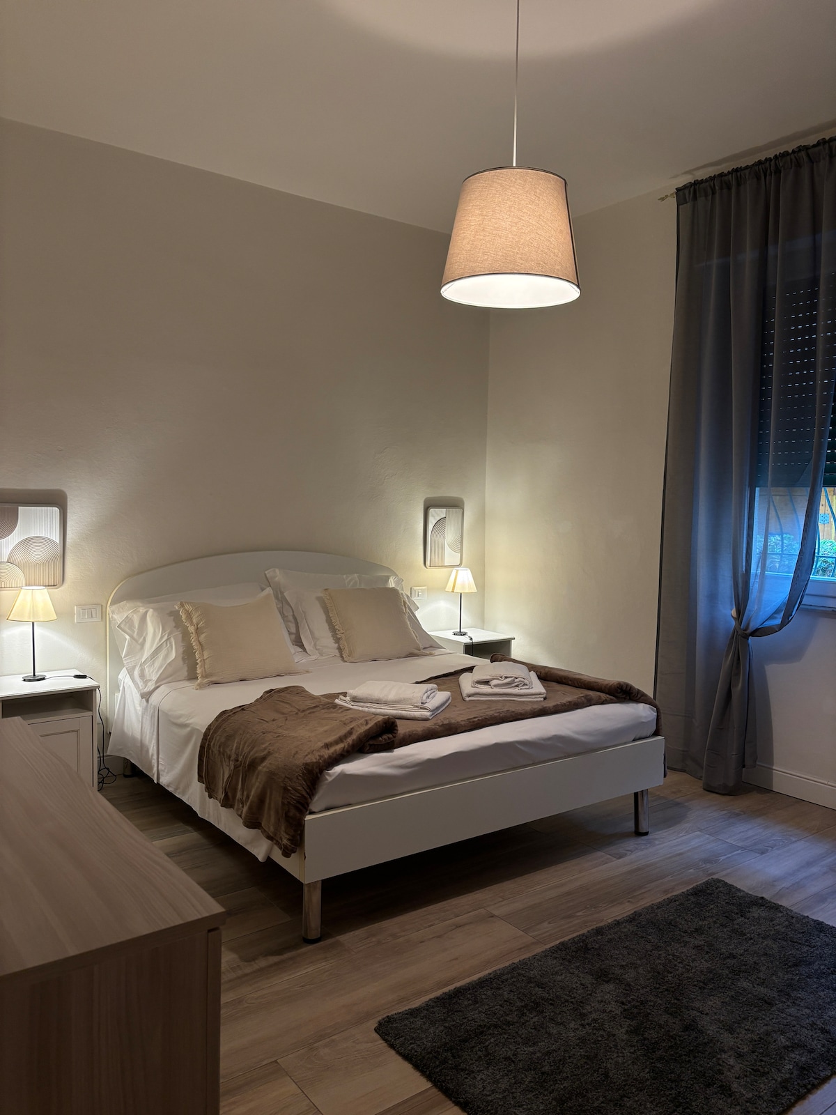 Grazioso e comodo appartamento a 10 minuti a piedi dal centro di Pisa; composto da una camera matrimoniale, un ampio soggiorno con divani letto, bagno con box doccia, cucina abitabile e piccolo balcone. L'appartamento è indicato per famiglie, (2/4 ospiti) possibilità di self check-in. Raggiungibili in pochissimo tempo il centro storico, il Palazzo dei Congressi, l' Università e l'ospedale di Cisanello. A pochi passi si trova un supermercato, vari servizi e il Viale delle Piagge con free parking.