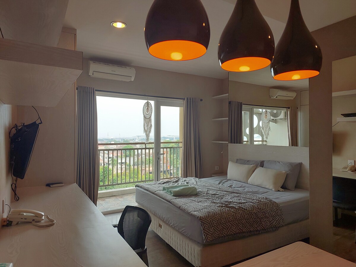 Monolocale moderno con vista sul monte Merapi: posizione strategica con servizi completi! Dotato di Wi-Fi veloce, Smart TV da 43 pollici con Netflix, YT Premium, aria condizionata, scaldabagno e lavatrice. Questo appartamento offre una vista mozzafiato sul monte Merapi. Perfetto per rilassarsi dopo aver studiato, lavorato o esplorato la città. Situato vicino all'UGM, a centri commerciali, ristoranti e mezzi pubblici, è la scelta ideale per chi viaggia per lavoro, per studenti o turisti.