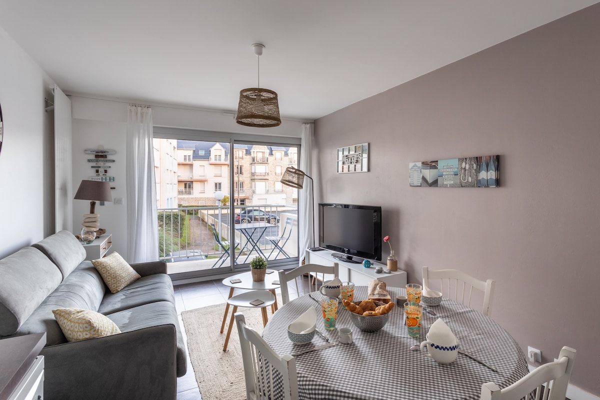 Appartement 2 pièces en rez-de-chaussée d'une grande maison, idéalement situé à 200 mètres du GR34, à 700 mètres de la Grande plage de St cast /du centre ville et à 700 mètres de la plage de la Mare, plus calme. Idéal pour découvrir St Cast et ses criques (Pissotte, Fresnay, ..) et randonner sur le chemin des douaniers. Accès séparé par une véranda plein Sud donnant sur le jardin. Literie incluse mais PAS les serviettes.