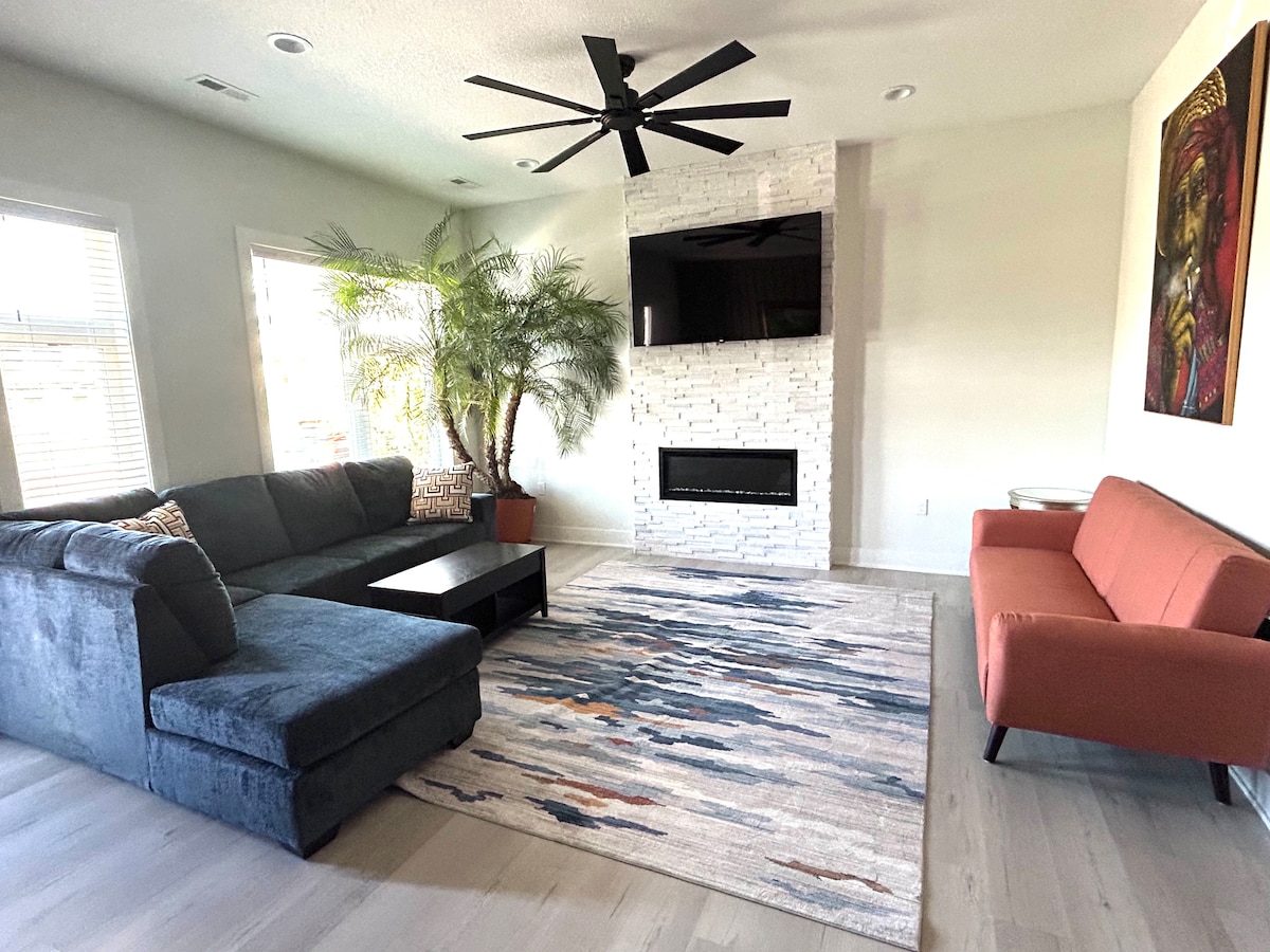 Rilassati con stile nella nostra casa moderna e accogliente! Rilassati nella vasca idromassaggio per 8 persone, disintossica la sauna o vivi in palestra. Il nostro arredamento chic aggiunge un tocco retrò. Ogni camera vanta biancheria da letto accogliente, materassi di prim 'ordine, smart TV e tanto spazio nell'armadio. Cucina completamente attrezzata e barbecue all'aperto per avventure culinarie. Immerso nel tranquillo Prairie Village, a soli 6 minuti dalla I-35.
