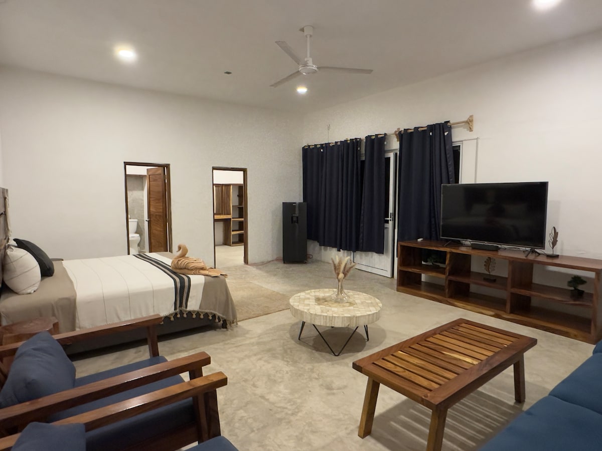 Suite bella e spaziosa con letto king size, TV girevole da 50", aria condizionata, cucina, bagno e piscina privata. Senti la tranquillità, rilassati nell'idromassaggio della tua piscina privata e goditi il comfort di avere tutto il necessario per un piacevole soggiorno. Siamo a Punta Zicatela, a 7 minuti a piedi dalla spiaggia, dal principale punto per il surf, da ristoranti, bar e dalla zona dello shopping. Vicino a tutto, ma lontano dalla frenesia della festa. Disponiamo di Internet Starlink