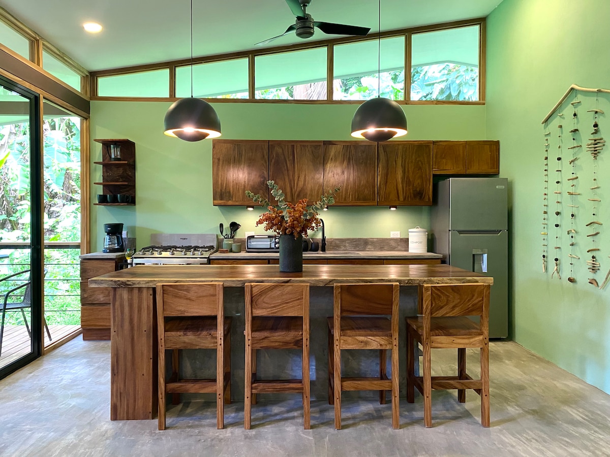 Villa moderna e minimalista nascosta nel mezzo della giungla costaricana, a pochi minuti da due spiagge appartate e poco frequentate, e da alcuni dei migliori spot per il surf del Pacifico. Situata proprio tra le rinomate città di Samara e Nosara, la casa tropicale è la destinazione perfetta per ospitarti mentre ti godi l'ecoturismo, il lavoro a distanza o il relax completo. Goditi una fantastica connessione wifi con backup, aria condizionata, acqua calda e una cucina integrata, tra una vegetazione lussureggiante e la fauna selvatica.