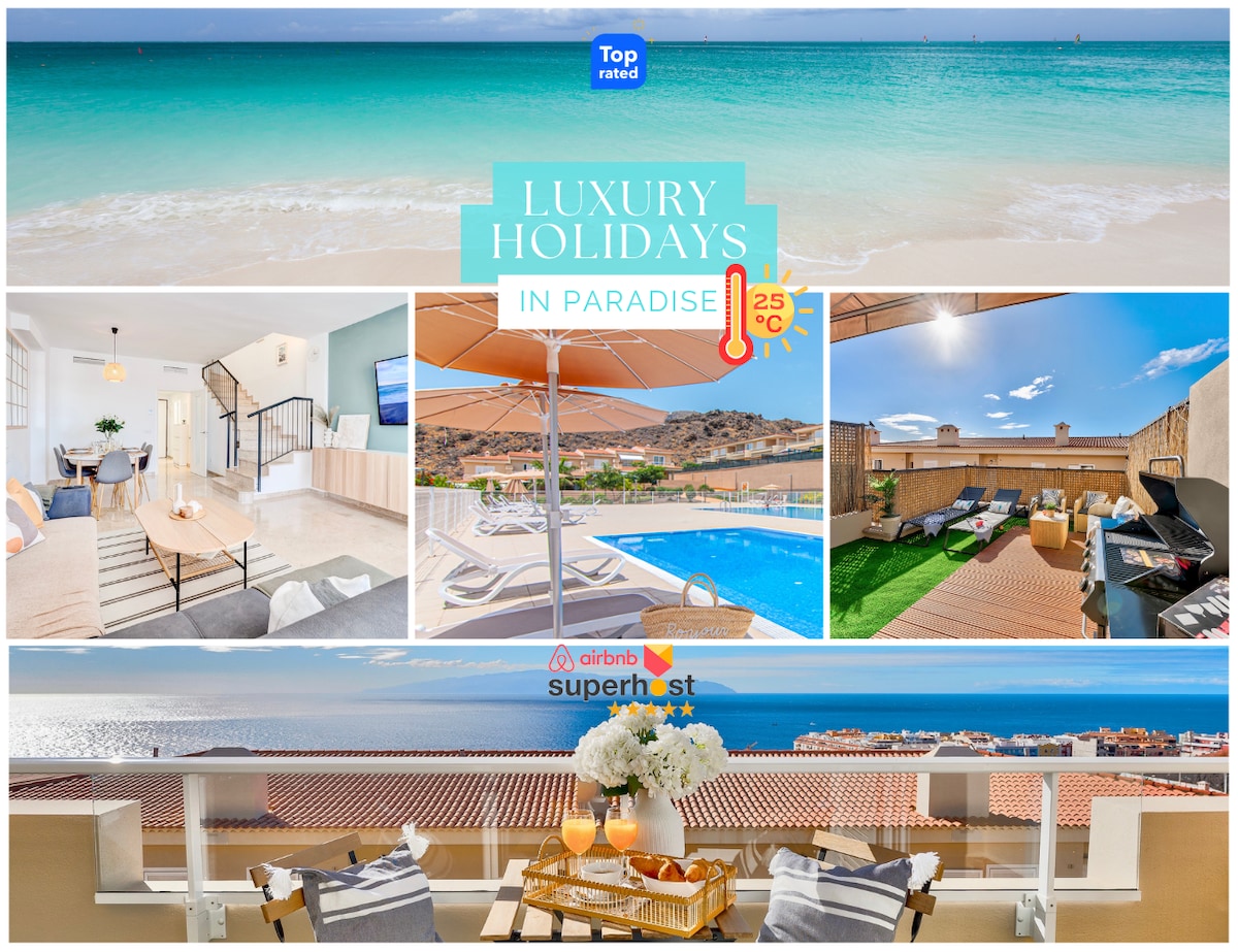 Questa lussuosa villa a Los Gigantes offre splendide viste sull'oceano e sulla scogliera. Dispone di tre spaziose camere da letto, ognuna con bagno interno, più un bagno per gli ospiti. Ideale per 4 adulti e 2 bambini, la villa include una cucina completamente attrezzata, una lavanderia, la connessione internet ad alta velocità e tutti gli elementi essenziali per un soggiorno confortevole. Goditi l'area barbecue e rilassati nella piscina riscaldata sulla terrazza soleggiata. Perfetta per una vacanza in famiglia o un rifugio romantico, con paesaggi mozzafiato tutt'intorno.