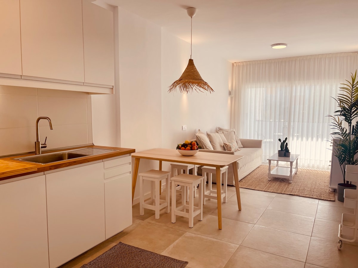 Cosy apartment located on the beachfront. Perfect for quiet vacations. Enjoy the sea view from the balcony and the closeness of the beach. The sand is a few steps from the apartment and the complex has a private access to the beach. The ideal place to escape from the routine and stress, enjoying one of the best sunrises of the island. The apartment is fully equipped so you will have everything you need for your stay. The boho-chic decorated living room has a 65-inch TV and a bed couch. WifiTOP