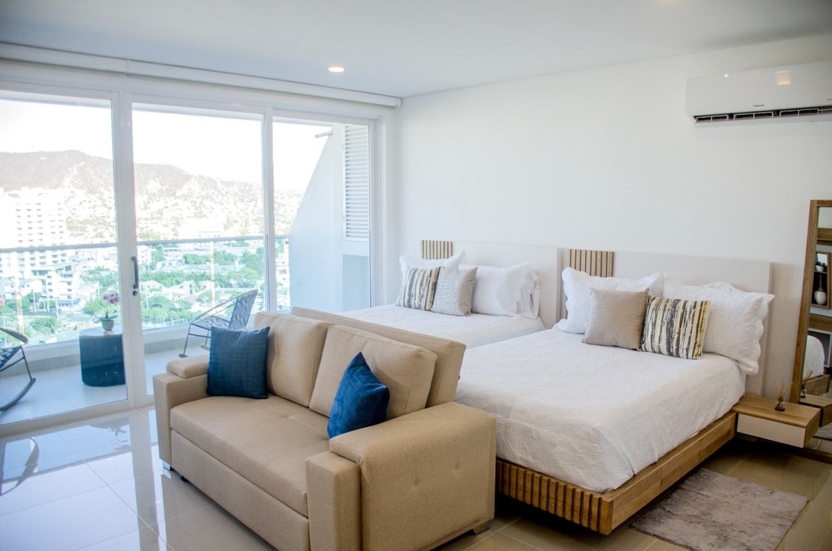Moderno appartamento loft con vista sull'oceano a soli 100 metri dalla spiaggia di Rodadero. Perfetto per 1-3 ospiti, con un grande letto, divano letto, cucina attrezzata, spazio di lavoro dedicato e bagno dal design moderno. Include servizi incredibili: piscine per adulti e bambini, palestra completa, sauna e area barbecue. Il wifi ad alta velocità è incluso. Posizione privilegiata vicino a ristoranti, zona commerciale e attrazioni turistiche. La tua vacanza perfetta nei Caraibi colombiani!
