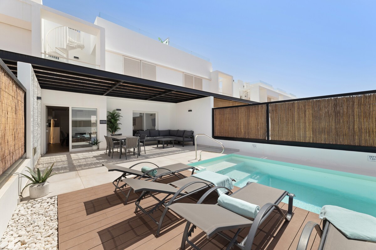 Piano terra: grande salone open con cucina attrezzata zona pranzo e zona tv - relax, dispensa e zona lavatrice, e grande bagno con doccia Primo piano: - Suite con bagno privato e vista mare, terrazzino privato, scala che porta a solarium attrezzato con meravigliosa vista di tutta Playa Blanca e Fuerteventura -camera da letto matrimoniale con zona studio -camera con 2 letti singoli con la possibilita' di unirli Aria condizionata e ventilatori al soffitto. Giardino con piscina privata.