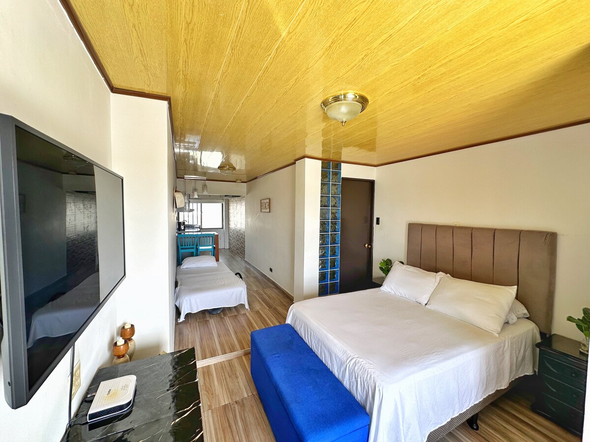 Apartaestudio un ambiente sin divisiones ideal para familias o amigos ubicado en el mejor sector residencial de la isla barrio sariebay cerca a aeropuerto y playa del centro y peatonal .1 kilómetro del centro y 12 minutos a pie de la playa principal . Limpio ,económico y acogedor. El apartaestudio cuenta con un solo ambiente con aire acondicionado, baño interno , Cocina privada interna, nevera y tv canales nacionales .