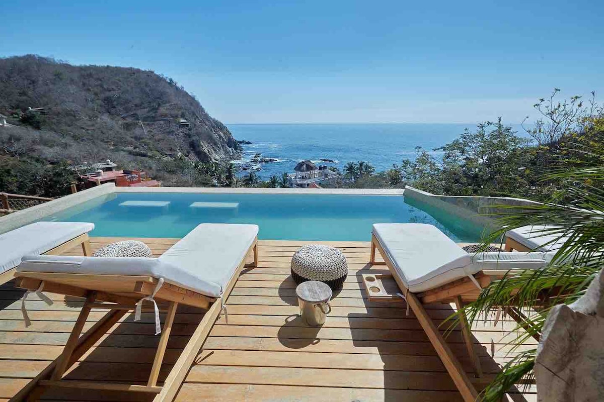 Ti diamo il benvenuto a Monte LALALA, Incastonato sulla collina di Mermejita, Monte LALALA offre un rifugio tranquillo con una vista eccezionale sull'Oceano Pacifico. La casa è composta da 3 aree separate per un massimo di 12 ospiti - Cucina a vista + salotto e piscina a sfioro - Suite con 2 camere da letto e vista panoramica - Suite con 2 camere da letto immersa nella natura tropicale A 15 minuti in auto da Mazunte/la spiaggia su una strada sterrata accidentata **30 scale per accedere alla casa** acqua calda, ventilatori, zanzariere, WIFI. @monte_lalala