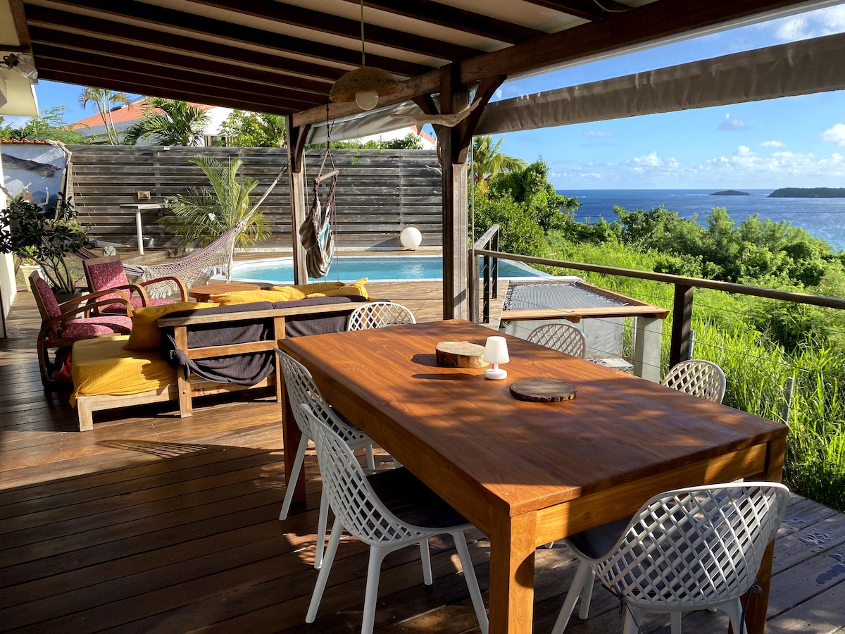 Au coeur de la Presqu'île de la Caravelle, dans son écrin vert serti d'eau, la Villa Vert Azur est idéalement située et offre une vue panoramique exceptionnelle. Vous pourrez ainsi dans l'éclat du lever du soleil contempler la baie du trésor et le phare de la caravelle ainsi que dans son sublime coucher la silhouette imposante de la montagne pelée et les pentes des pitons du carbet