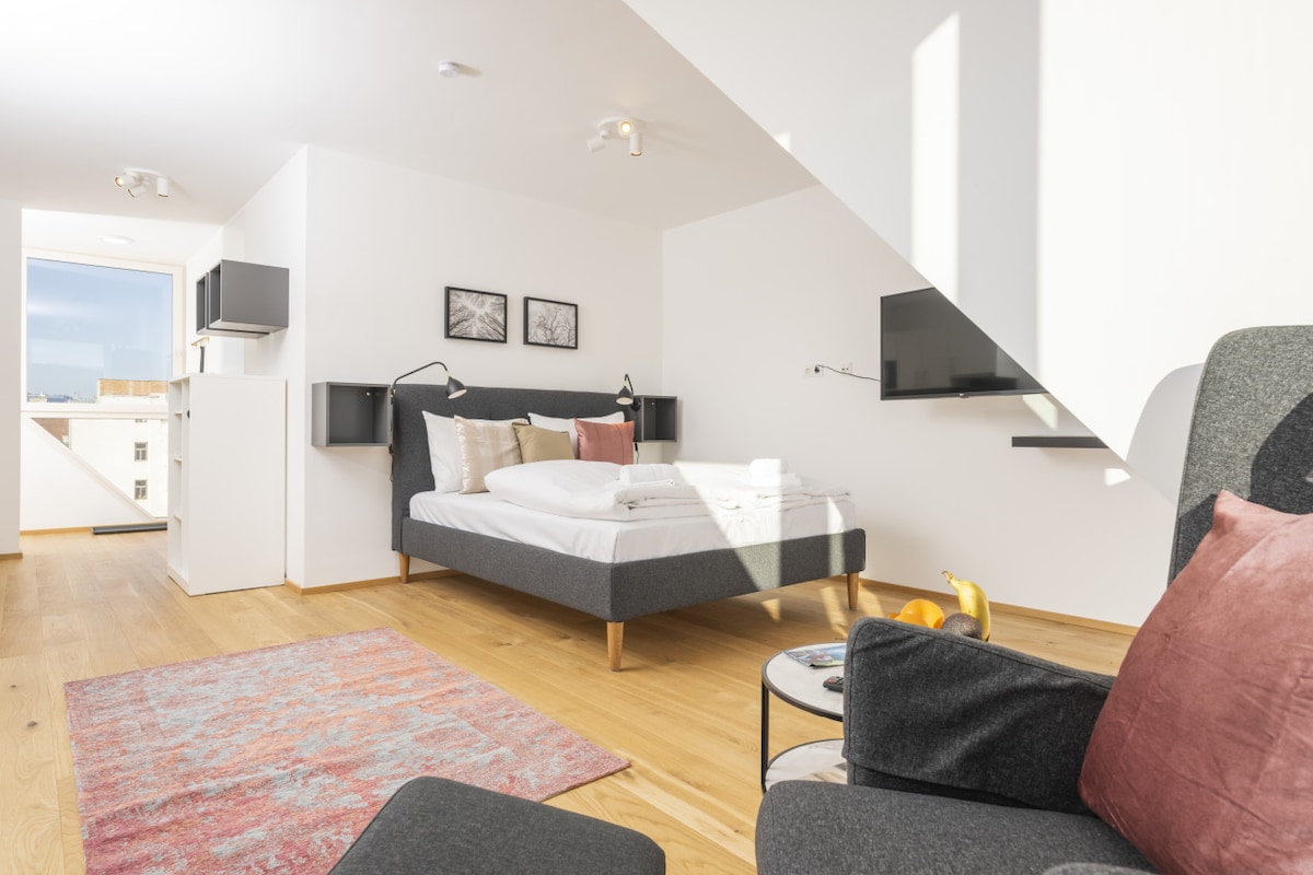 Comfort moderno in una posizione tranquilla – la tua casa temporanea a Vienna. L'appartamento offre una camera da letto con comodo letto king size, un luminoso soggiorno con divano, smart TV con Netflix e una cucina completamente attrezzata. Il bagno moderno con cabina doccia offre un comfort aggiuntivo. Il punto forte è il balcone privato sul tranquillo cortile interno. In pochi minuti si arriva alla metropolitana, a circa 10 minuti dal centro della città. Ideale per coppie, viaggiatori d'affari e viaggi in città. Self check-in contactless incluso.