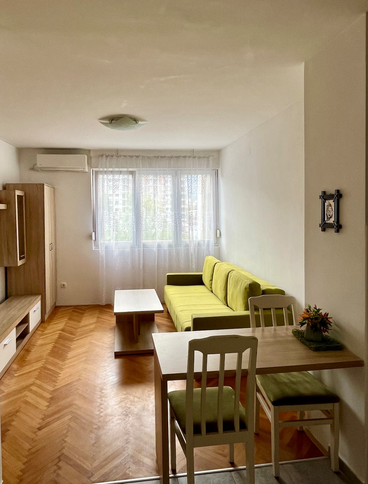 We offer a discount on long terms. Located in a green and quiet area, just 450 meters from the main bus and train station, and about a 25–30 minute walk to Bar’s city center. One bedroom with a double bed, fresh linens, wardrobe with hangers, and an iron A living-dining area with a table and 3 chairs, sofa bed, TV, high-speed internet, and air conditioning A compact kitchen with an oven and small refrigerator A bathroom with a shower and washing machine Tourist tax of €1/day is not included.