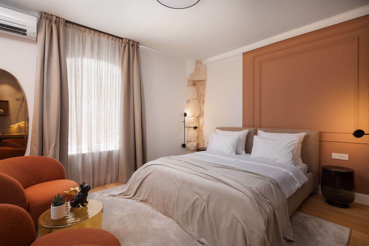 Svegliati sotto le travi a vista di soffitti in legno secolari. Lasciati incantare dai tocchi antichi, dalle scale in stile industriale e dalle finiture raffinate, nascoste dietro i vasti e massicci archi interni in pietra del Palazzo Imperiale. Immergiti nella storia e bevi un bicchiere di vino sul balcone di questo loft unico dopo aver esplorato le delizie di Spalato, dove pezzi da museo adornano una palette di sabbia e tenui tonalità terrose.