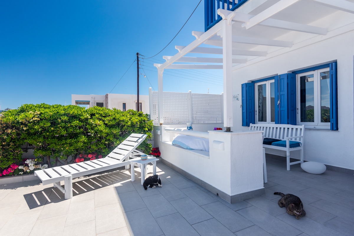La nostra tradizionale casa cicladica ha cento anni ed era un rifugio estivo per la nostra famiglia.Si trova sul lungomare nel pittoresco villaggio di pescatori di Mandrakia sulla costa settentrionale dell'isola. La nostra casa si trova proprio sul bordo dell'acqua. e quindi ha una vista panoramica sul mare. Dalla nostra veranda godrai di una vista mozzafiato sul Mar Egeo e avrai accesso diretto all'acqua. Esci dalla porta d'ingresso,scendi una scalinata verso il mare per fare snorkeling o nuotare.