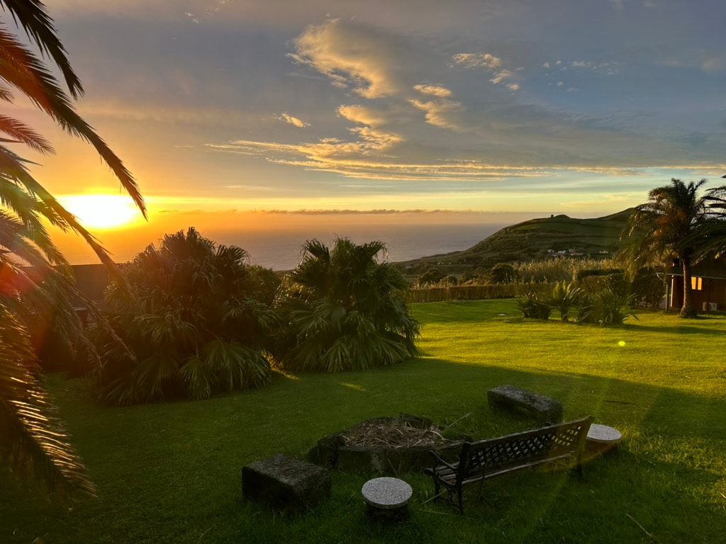 Start and end your days in Azores with the view of the ocean and the sunset right at your doorstep. This wooden house has a room with a queen size bed, a living room with amazing views, a small but well-equipped kitchen, and an outdoor barbecue. The house is located in a 4500m2 garden. You share it with another wooden house and the main house where your host lives. Plants have been carefully grown to grant each house privacy.